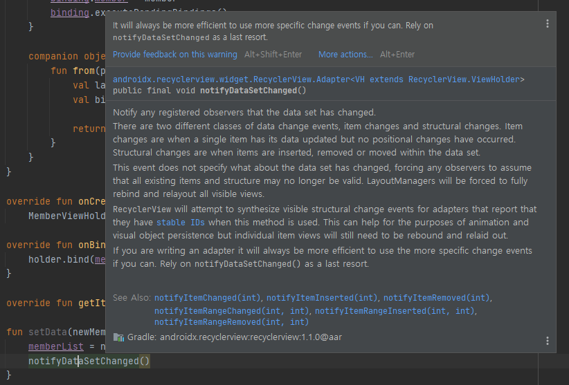 보면 notifyDataSetChanged()를 호출하기보다는 다른 방법을 쓸 것을 권장하고 있는데, 이는 notifyDataSetChanged() 함수의 작동 방식이 리스트 전체를 업데이트하는 방식이기 때문에, 리스트의 아이템 일부만 변경된 경우 등에는 이 함수를 호출하는 것이 비효율적이기 때문입니다.