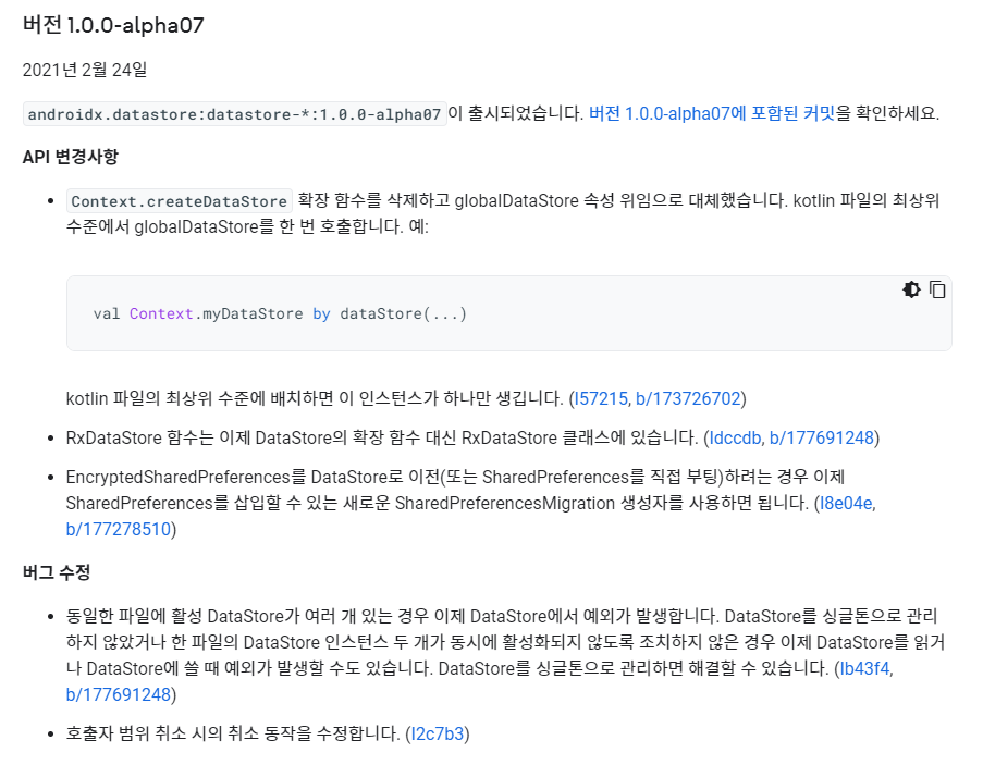 DataStore 비동기적이고 일관된 트랜잭션 방식으로 데이터를 저장하여 SharedPreferences의 일부 단점을 극복합니다. 최근 업데이트 현재 안정화 버전 다음 버전 후보 베타 버전 알파 버전 2021년 8월 4일