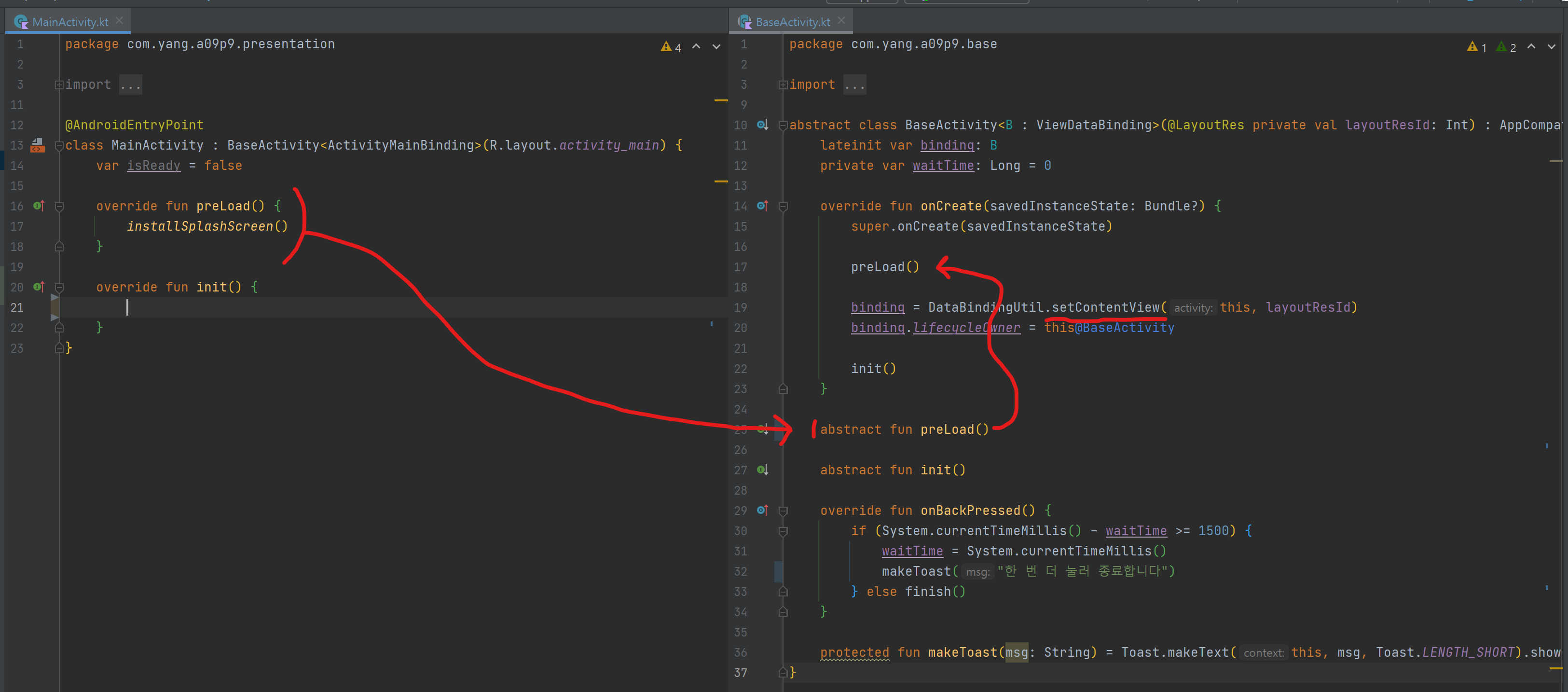 이제 액티비티 단에서, setContentView를 호출하기 이전에 installSplashScreen() 함수를 호출해줍니다.