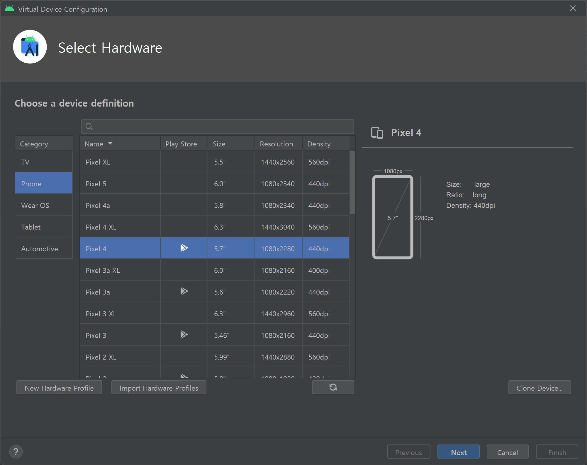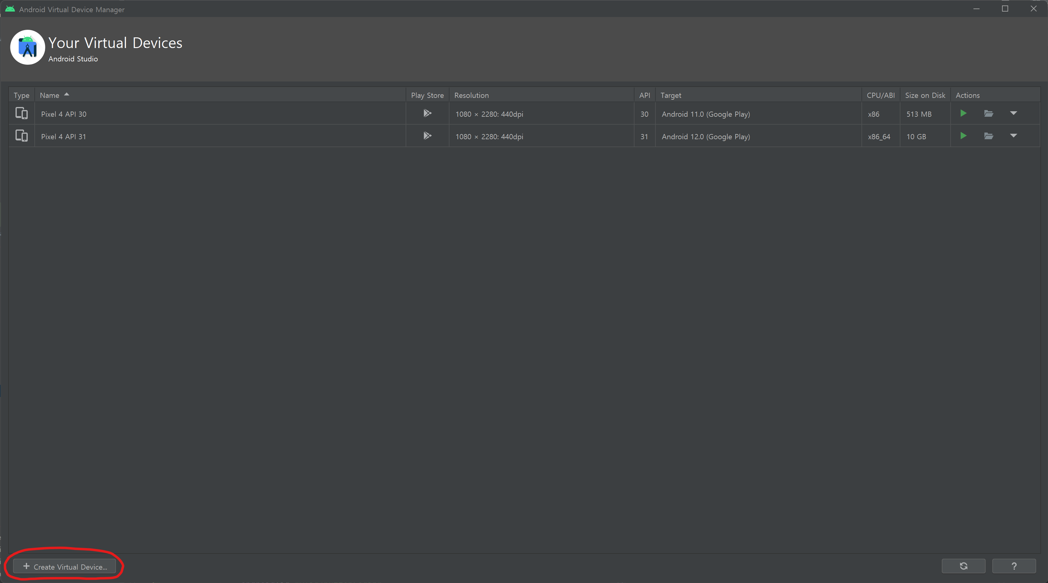 AVD Manager에서 Create Virtual Device 버튼을 클릭합니다.