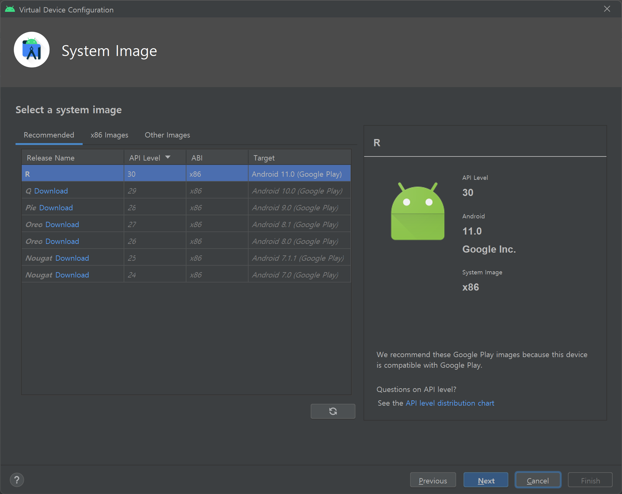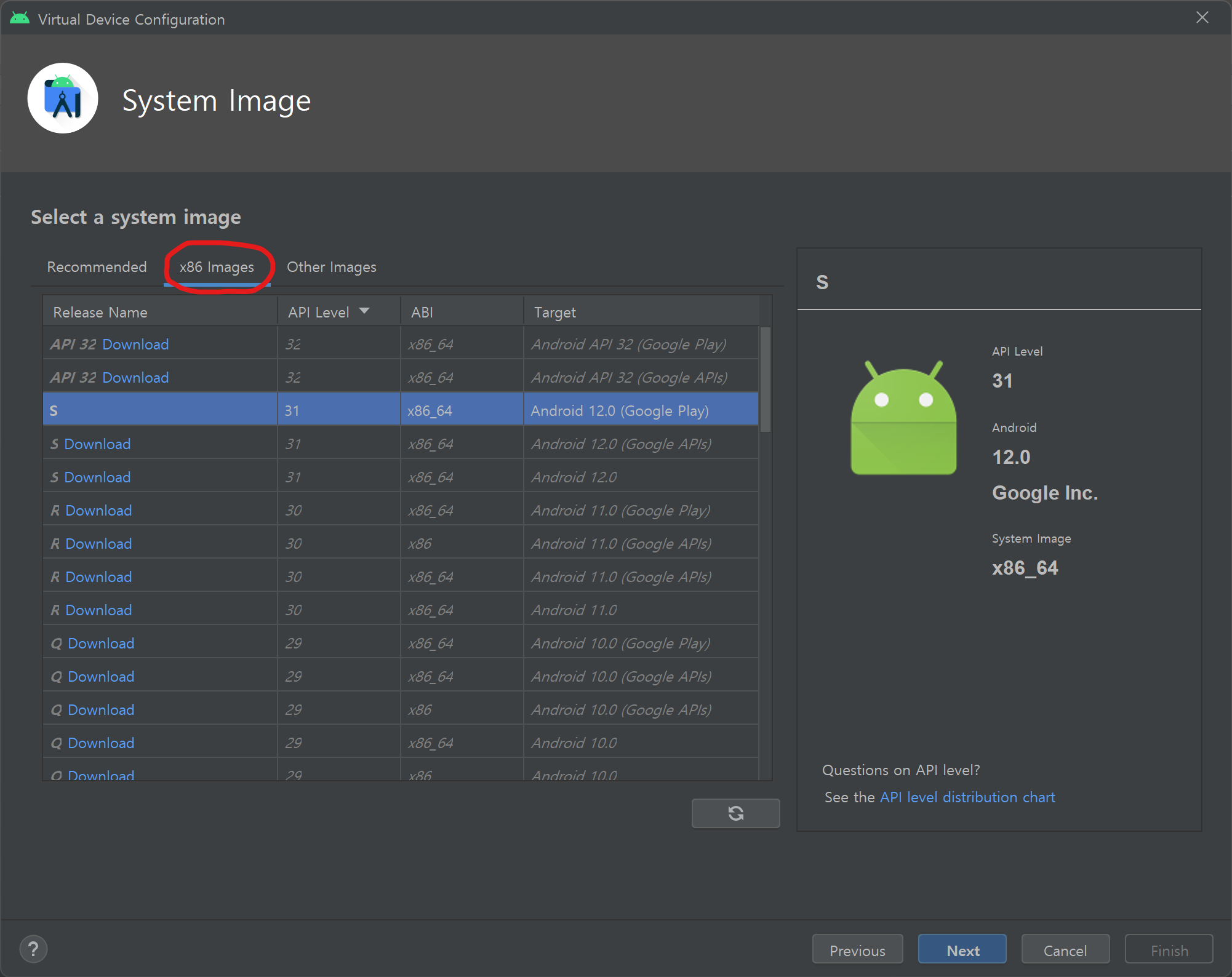 Recommended 옆의 x86 Images를 클릭해주면 모든 API 버전을 고를 수 있게 됩니다.