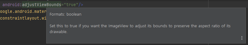 adjustViewBounds 속성의 설명에 따르면, 이 속성은 ImageView가 자신이 표시하는 drawable의 비율에 맞춰 자신의 크기를 조절할 수 있게 한다고 나와 있습니다.