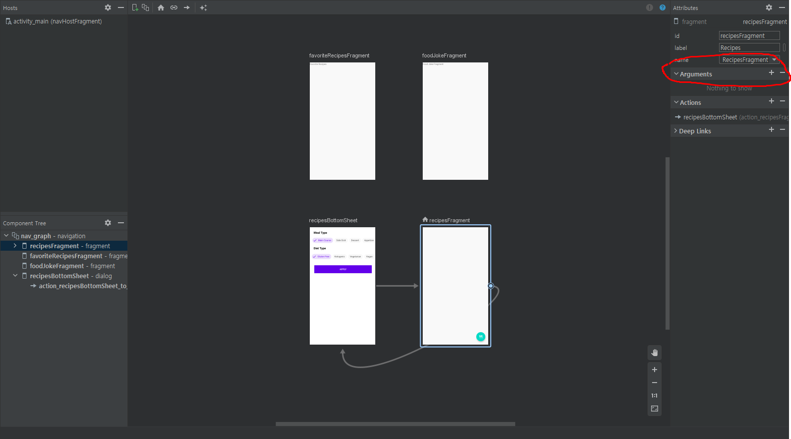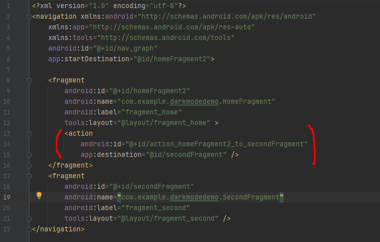 만들어진 액션은 출발점이 되는 프래그먼트의 안에 <action> 태그로 저장된다.