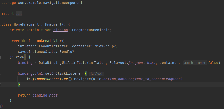 대충 이런식으로 findNavController() 함수를 통해 내비게이션 컨트롤러를 받아오고, navigate() 함수 안에