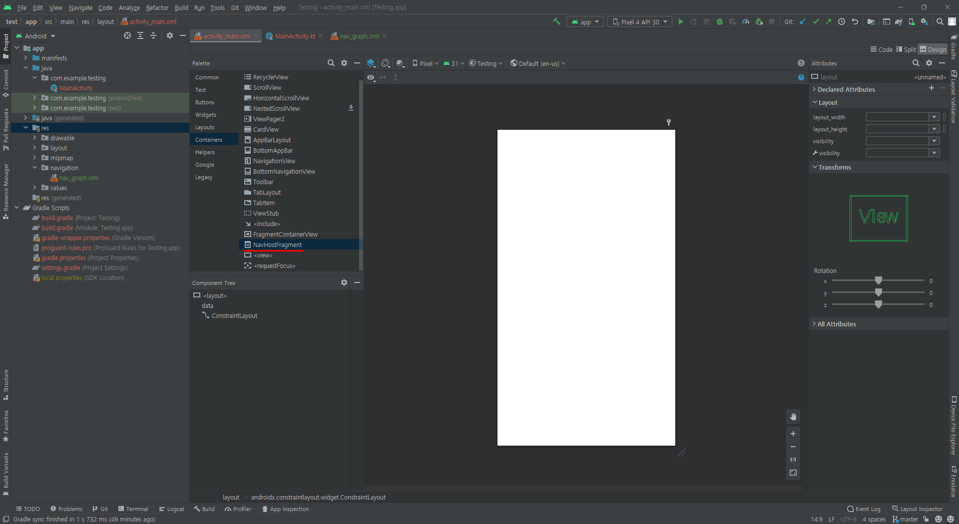 프래그먼트를 표시할 액티비티의 xml 파일에 NavHostFragment를 드래그해서 넣어준다.
