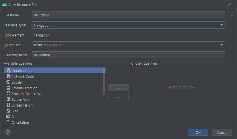 파일 이름은 nav_graph, Resource type은 Navigation으로 해주고 OK를 누른다.